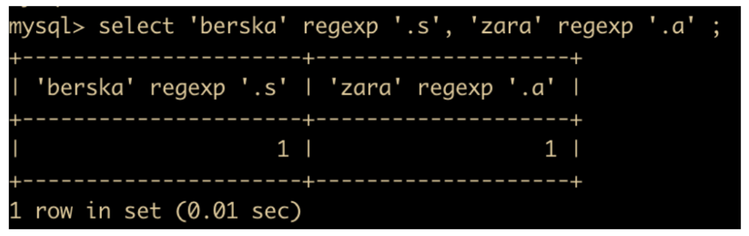select 'berska' regexp '.s', 'zara' regexp '.a';