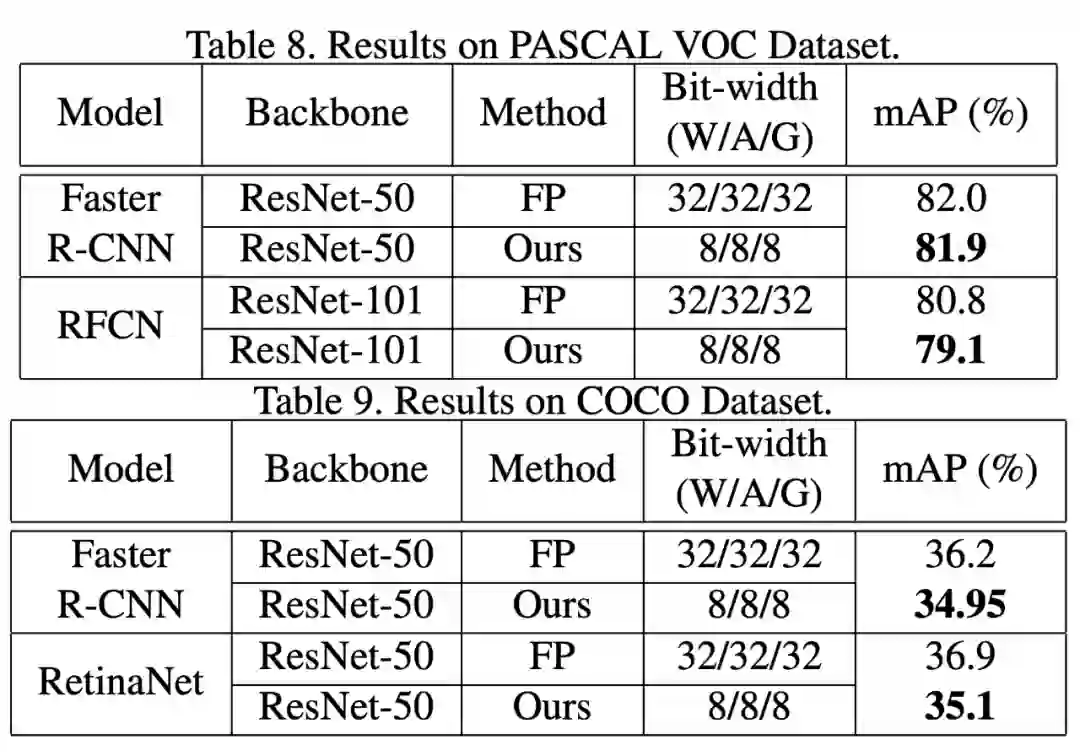 目标检测任务:同时,本文也首次尝试在PASCAL和COCO等目标检测数据集上进行INT8训练实验,精度损失也在2%以内。