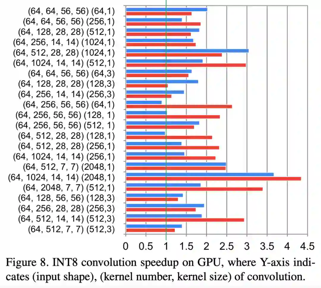 已有的少量探究梯度量化的论文[4]均未报告算法在实际训练任务中的真实加速性能,为了最大限度将方法实用化,本文在 GeForce GTX1080TI显卡上编写并优化了用于支持INT8训练的卷积前向和后向计算核心。