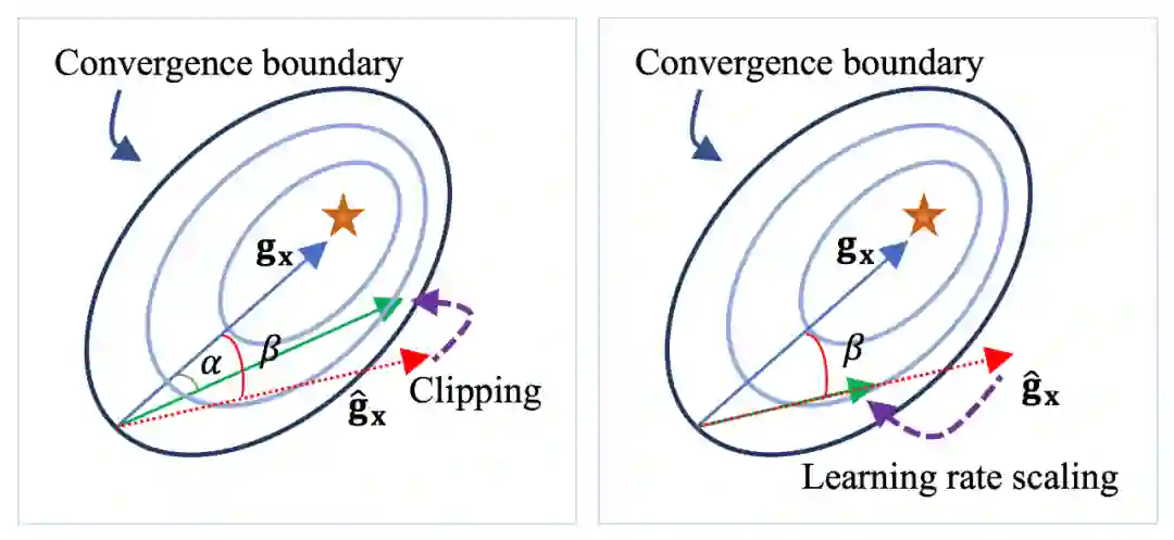 以图2为例,上图中的五角星是优化的最优点(即蓝色箭头指向的点),左边图做量化时的红色箭头存在量化误差,偏离了最优方向,这时候做一个截断,使得红色的箭头变到绿色的箭头,更接近五角星,收敛性更好一些。