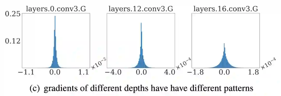 梯度的分布随网络深度变化情况从图(c)中可以看出。很容易发现,卷积层的深度越浅,梯度分布越尖锐,这也会导致梯度量化的误差更大。