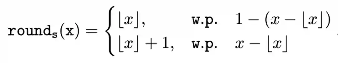 为了降低量化带来的误差,一个常见做法是对取整过程进行随机化,使得取整函数从期望上更接近原始的数,具体随机取整的公式如下: