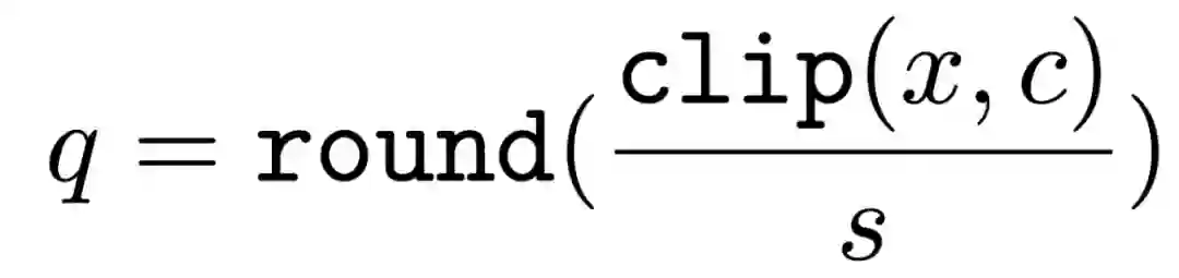 常用的浮点量化操作是线性均匀的,本文中使用的是对称量化,具体公式如下,其中x是被量化的数据,q是量化后的数据,s是量化系数,clip是截断函数,round是取整函数: