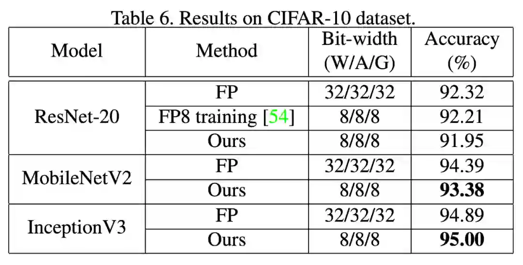 图像分类任务:本文在CIFAR10和ImageNet等图像分类数据集进行INT8训练实验。从下表结果中可以看出,在大多数网络结构中均取得了比现有最好方法更优的精度,并且首次在MobileNet、Inception等网络上进行量化训练实验,精度损失也在1.5%以内。