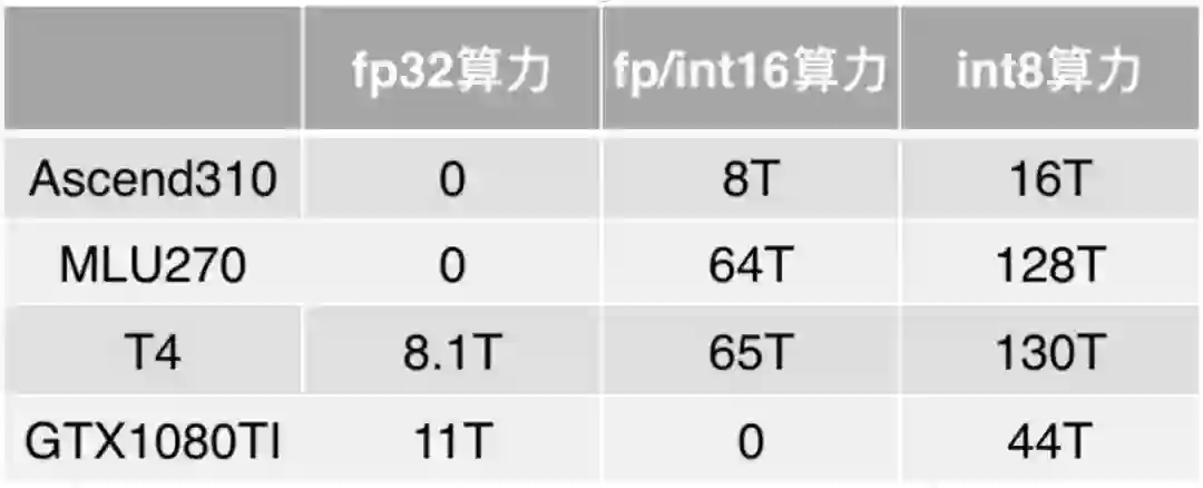 表1:相比行业常用的32位浮点计算(fp32)和16位浮点计算(fp/int6),int8的定点计算在各类芯片的计算力均有2倍以上提升
