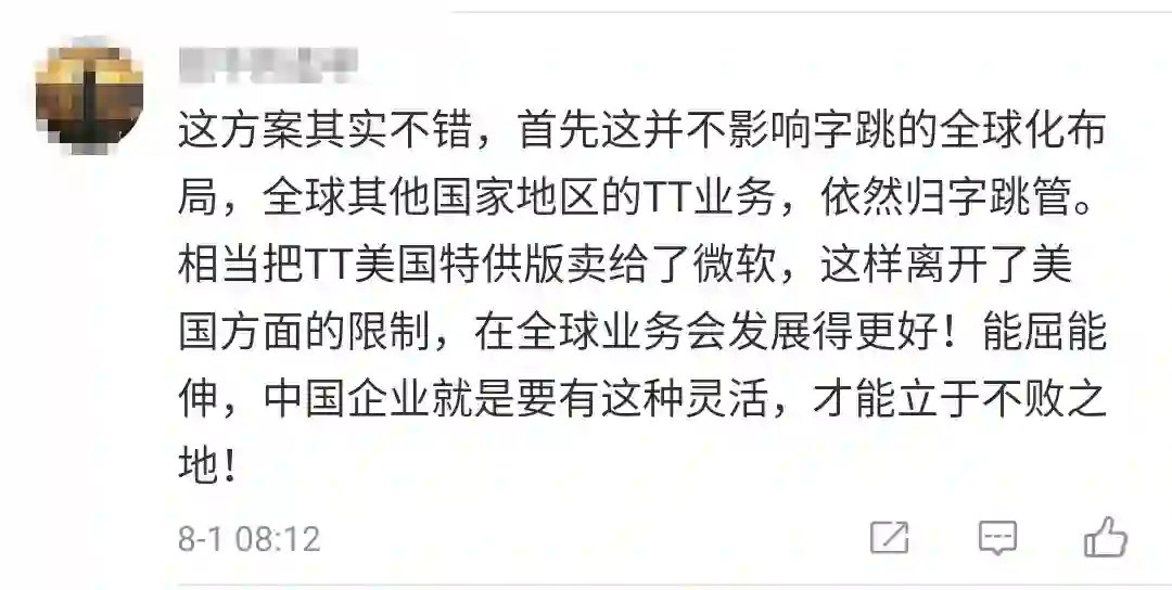 评论表示,方案其实不错,首先并不影响字节跳动的全球化布局。毕竟字节跳动的海外版图也不只有美国。这一番操作只是相当于把美国特供版卖给了微软,离开了美国的限制,全球业务才会发展得更好。