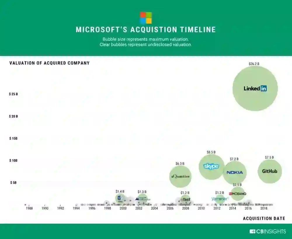 微软一直以来以疯狂撒币收购著称,从1987年 1400 万美元第一次现金收购了 Forethought以来,微软进行了超过 250 次的收购及投资,CB Insights 还制作了微软史上 TOP10 并购事件的可视化图表。