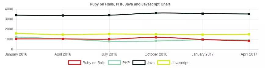 最初打破 PHP 领导地位的是 Ruby on Rails。多年来,我看到公司们和开发者们进行了这一转型。Ruby on Rails 经历了一段时间,在这个时期它是这个领域的首选语言。然而,从我们收集的数字来看,它的光泽似乎已经失去了一点。虽然没有像 PHP 这样的衰退,但其数量一直保持相对平稳,它曾经有过的增长似乎停滞不前。