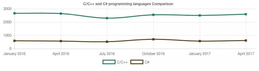 在应用程序领域中使用的另一种语言是 C++。虽然它的数量不能与 Java 竞争,但它仍然在这个领域占据了很大的市场份额。而且每 3 个招聘中有一个要求 Java,C++ 则是每 4 个中有一个要求它。与 Java 非常类似,其数量在过去六个季度中保持相对稳定。C++ 一直被大量使用,即使 Java 已经取代它,它仍然是一种高度相关的语言。