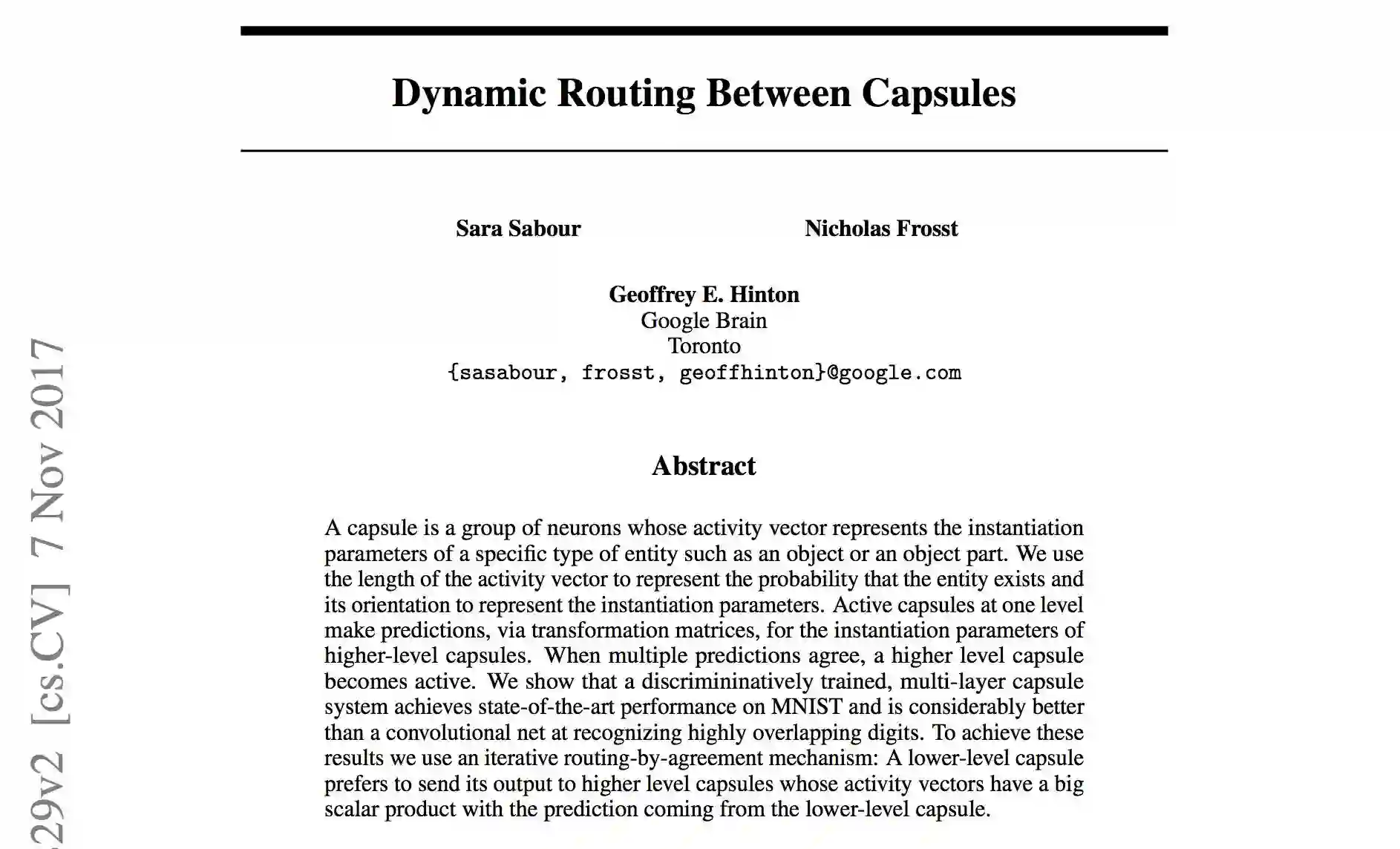 今年11月7日,Geoffrey Hinton老爷子发表了“Dynamic Routing Between Capsules”的论文,提出了“胶囊网络”,胶囊网络在MNIST手写数字识别上的表现超过了CNN,一时引发了热议。