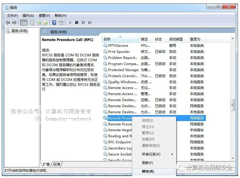 步骤1:在“管理工具”窗口中双击“服务”图标,即可打开“服务”窗口。在其中可以看到本机中所有的服务,如图10所示。在“服务”列表中右击Remote Proceduce Call(RPC)服务,在快捷菜单中选择“属性”选项,即可打开“Remote Proceduce Call(RPC)的属性(本地计算机)”对话框。