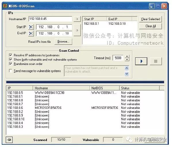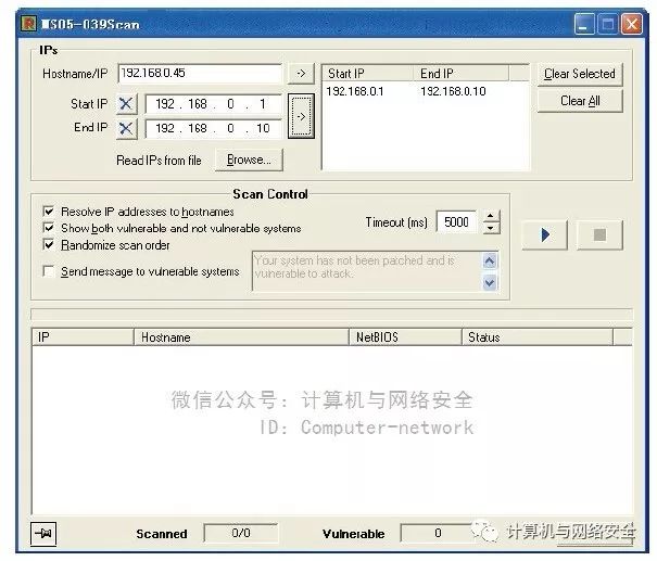 步骤2:单击Scan按钮,即可开始扫描,如图9所示。如果在设置的IP范围中有存在RPC漏洞的主机,则该主机的详细信息将出现在扫描结果中。