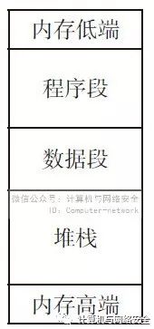 一个程序在内存中通常分为3部分,分别是程序段、数据段和堆栈。其中程序段放的是程序的机器码和只读数据,数据段放的是程序中的静态数据,动态数据则通过堆栈来存放。3部分在内存中的位置如图1所示。
