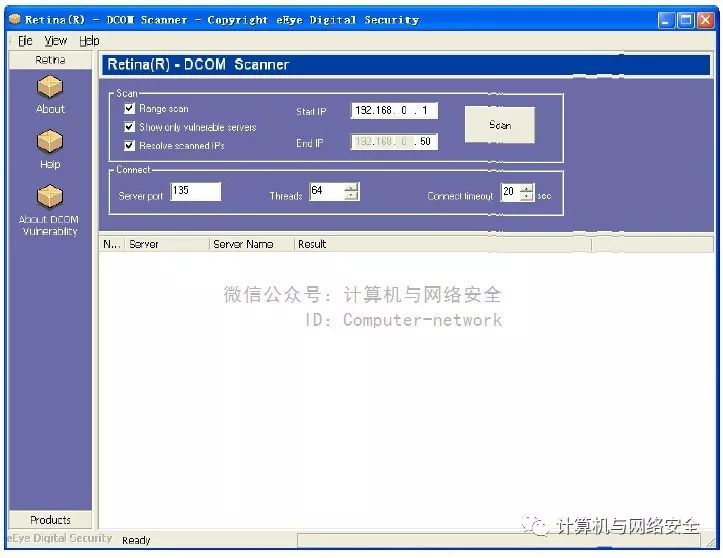 检测这类漏洞可使用RPC漏洞专用扫描器Retina(R)–DCOM Scanner。它是eEye安全公司针对微软MS03-026以及最新MS03-039 RPC DCOM漏洞设计的扫描工具。