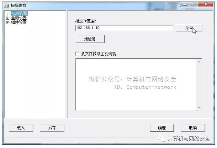步骤2:在X-scan主窗口中选择“设置”→“扫描参数”菜单项或单击工具栏中的按钮,即可打开“扫描参数”窗口。在其中可以输入目标主机IP地址的扫描范围,也可以输入IP段,如图3所示。