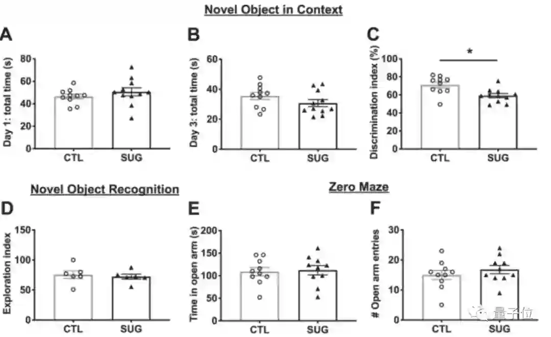相比幼年时喝白水长大的小鼠,喝了太多糖水的小鼠在探索熟悉物体B上消耗的时间更长,也就是对它的记忆能力变弱了。