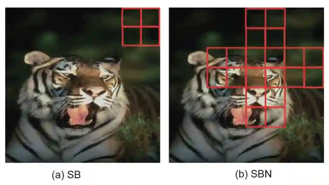 图 5 图像包生成器。假设每张图像的大小为 8×8,每个小块的大小为 2×2。单小块(SB)生成器将每个由 4 个小块组成的图像块视为一个示例,通过不重叠地滑动为每张图像生成 16 个图像示例。有邻近的单小块生成器(SBN)将由 20 个小块组成的图像块作为一个示例,通过有重叠地滑动来为图像生成 9 个示例。