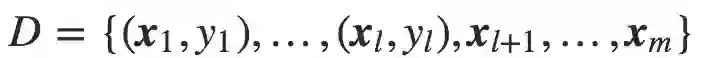 的样本)和 u = m - l 个未标注样本;其他条件与具有强监督的监督学习相同,如摘要最后的定义。为便于讨论,我们也将 l 个有标注示例称为「标注数据」,将 u 个未标注示例称为「未标注数据」。