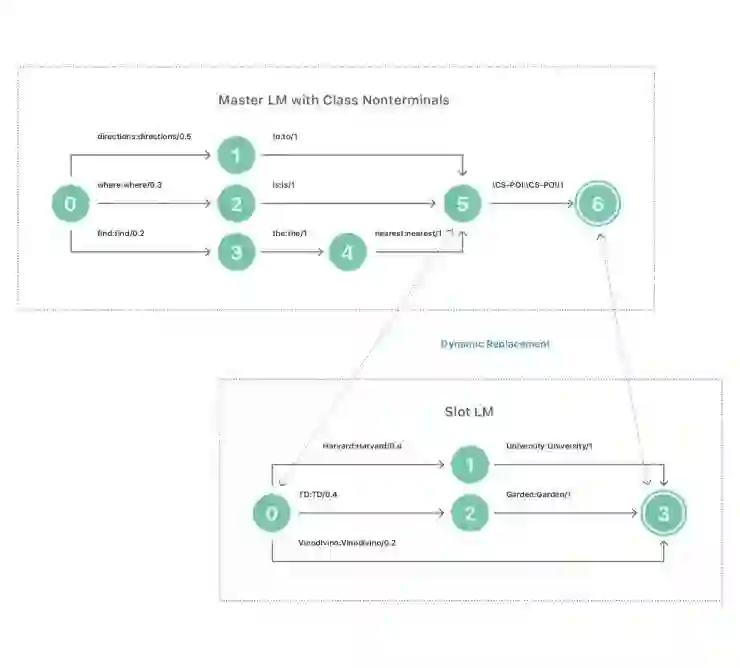 我们实现了一种类语言模型,在这个模型中,我们用类内语法动态地替换类非终结符。图2 对这个概念进行了说明。我们使用了一个主语言模型,将其用于通用识别,并且为预定义的类别引入了终结符标签,例如地理区域。对于每一个类,Slot 语言模型都是由与类相关的实体名称构建的,并且用于表示类内语法。接着,使用主语言模型和 slot 语言模型构建基于地理位置的语言模型,其实现过程如下节所述。