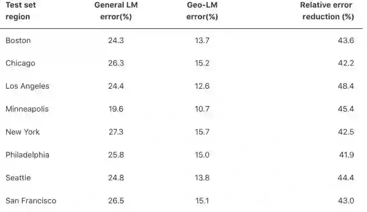 表4.在美国的八个主要的大都会区的最热门的 POI 测试集(T3)上通用语言模型和 Geo-LM 得到的字错误率对比