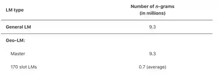 为了构建 slot 语言模型,我们从每天更新的苹果地图搜索日志中提取出被搜索的POI名称。提取出的POI被根据其地点和人口分成 170 组,从而为 169 个 CSA 和一个对应于没有被 CSA 涵盖的请求的全局组构建 slot 语言模型。每个 POI 的先验概率是根据它们在搜索日志中的使用频率设置的。表 1 显示了通用语言模型和 Geo-LM 的两个组成部分的 n-gram 的大小比较。Slot 在 170 个地理区域中,平均比通用模型的规模小的多。