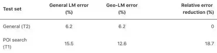我们的实验表明,使用本地化的信息可以使当地 POI 搜索的字错误率降低18%以上。在不包含大型 POI 使,字错误率会降低 40% 以上。