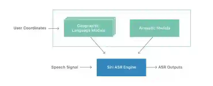 本文描述了我们是如何应对这一挑战的,通过将用户地理位置信息融入语音识别系统提升 Siri 识别本地 POI 信息点(point of interest,兴趣点)名称的能力。能够将用户的位置信息考虑在内的自定义语言模型被称为基于地理位置的语言模型(Geo-LMs)。这些模型不仅可以利用声学模型和通用语言模型(例如标准的语音识别系统)提供的信息,还可以使用用户周围的环境中的POI信息点的信息,更好地估计用户想要的单词序列。