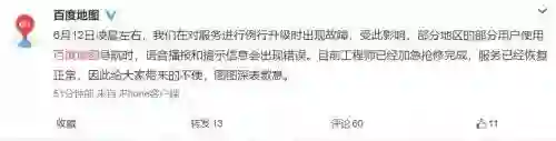 对此,百度地图官方进行了回应,称对服务进行例行升级时出现故障。目前工程师已经加急抢修完成,服务已经恢复正常。