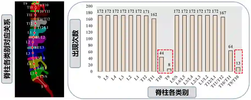 训练集中各类别样本数量严重不平衡,包含T9, T10,T9/T10这三个类别的图像分别仅占总样本量的4%、25%和7%,如下图所示。这导致这三类的分割结果在验证集中很不理想,单类准确率远低于其他类别的平均水平。为解决这一问题,团队对包含这三个类别的图片进行了针对性的手工裁剪,改变了训练图片中小样本类别的体积,从而构造了44张包含小样本类别的训练图片。团队用到的其他trick还包括:①在线数据增强,通过随机旋转-15°至15°、随机弹性变形、随机对比度调整等方法在线增强训练数据,提高模型的泛化能力;②学习率衰减策略,设置初始学习率为0.001并在90和144轮时将其调整为原来的0.2倍,从而使网络快速收敛到最优点;③提前停止,当验证集的评价指标停止增长时,及时停止训练,从而缩短训练时间。