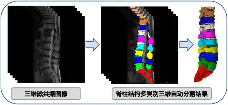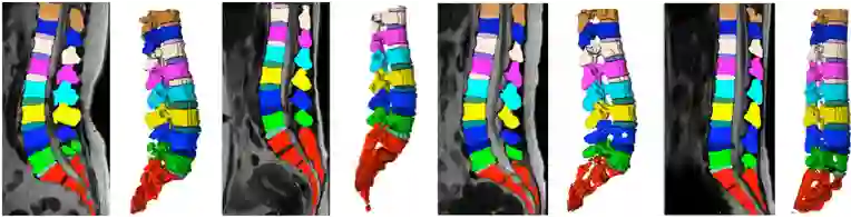 磁共振图像中脊柱结构包含多个类别(椎骨,椎间盘),下图中不同颜色代表脊柱结构不同的类别,可以看出本队提出的方法能够准确实现三维磁共振图像中脊柱结构的多类别分割。