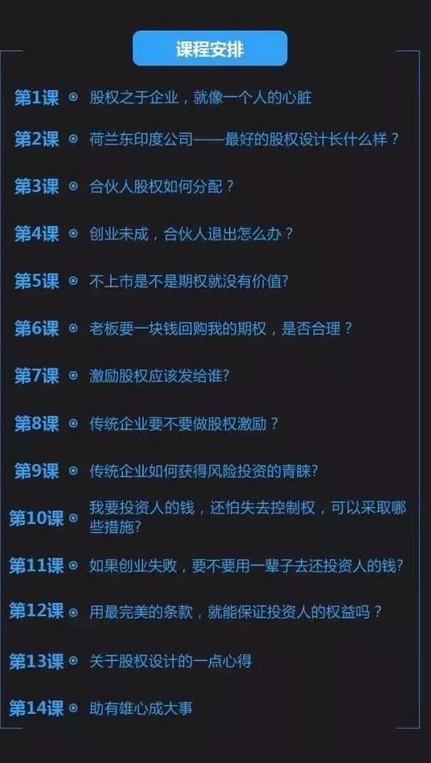 惊心准备的课程(14期课程+数十期专项音频答疑):可以让那些经验不足的创业者,迷惑的员工,不理解创业投资模式的投资人、传统企业家,都能有机会学习国内最顶尖的股权思想和经验。