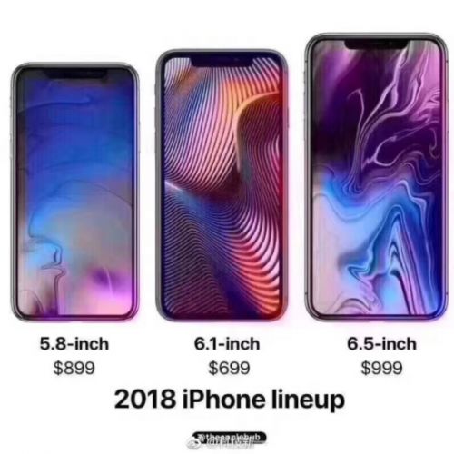 根据知名数码博主@科技新一的爆料显示,三款新iPhone的名称分别为iPhone XS(5.8英寸版)、iPhone XS Plus(6.5英寸版)、iPhone 2018(6.1英寸版),其中,iPhone XS和iPhone XS Plus除尺寸不同外,在外观配置方面基本一致,均配备OLED刘海屏,采用不锈钢机身,搭载全新的A12处理器,配备4GB内存和64/256/512GB存储,配备后置双摄,支持无线快充,支持Apple Pencil。