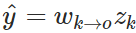 对于这样一个简单的案例来说,我们很容易就找到其偏导数项。现在我们将求导后的一部分标以蓝色,然后看看我们是否能推导出可以在迭代算法中使用的模式。首先我们需要了解 k 层到 o 层之间的权重(w_k→o),也可以理解成这两个神经元之间的连接强度。如果我们的输出是线性单元,那么():