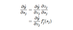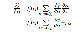 注意最后的偏导项 ∂y^ /∂zj,多神经元取决于 z_j,确切的说是所有 k∈outs(j)的神经元。我们在多个输出端的部分中看到,导致具有多个输出神经元的权重确实对这些输出神经元有影响。但对于每个神经元 k,我们有,每个 s_k 不取决于任何其它同层的结点。因此,我们可以再次使用链式规则并对 k∈out(j)的输出结点求和: