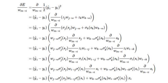 如果一个神经元有多个输入端怎么办,从 j 到 k 的权重更新规则会不会影响从 i 到 k 的权重更新规则?为了弄清这个问题,我们可以对 i 到 k 的权重手动求导。