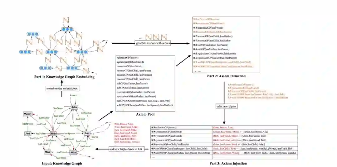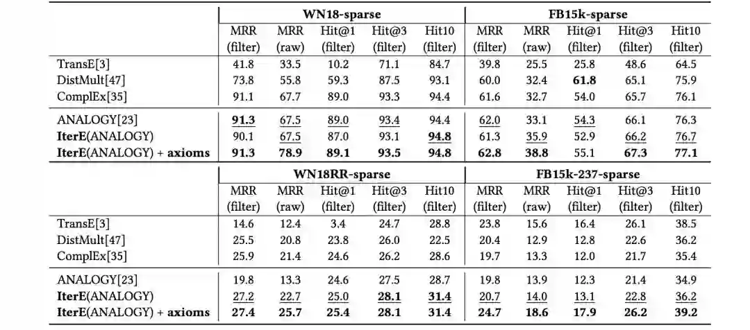 基于学习到的规则(axiom),就可以进行推理执行了。通过一种迭代策略,先使用嵌入(Embedding)的方法从图谱中学习到规则,再将规则推理执行,将新增的关系再加入到图谱中,通过这种不断学习迭代的算法,能够将图谱中的关系预测做的越来越准。最终我们的算法取得了非常优秀的性能: