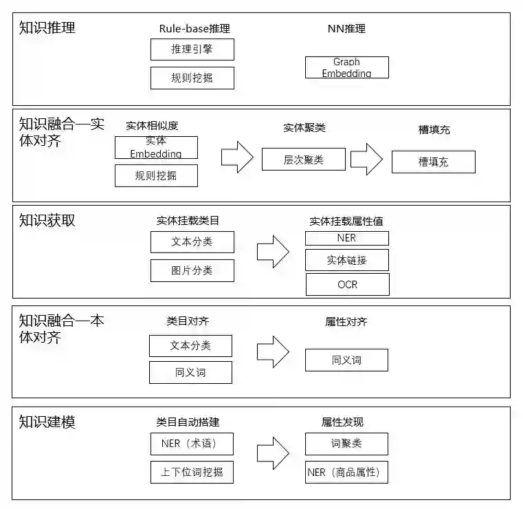 其中知识建模的任务是定义通用/特定领域知识描述的概念、事件、规则及其相互关系的知识表示方法,建立通用/特定领域知识图谱的概念模型;知识获取是对知识建模定义的知识要素进行实例化的获取过程,将非结构化数据结构化为图谱里的知识;而知识融合是对异构和碎片化知识进行语义集成的过程,通过发现碎片化以及异构知识之间的关联,获得更完整的知识描述和知识之间的关联关系,实现知识互补和融合;知识推理是根据知识图谱提供知识计算和推理模型,发现知识图谱中的相关知识和隐含知识的过程。知识服务则是通过构建好的知识图谱提供以知识为核心的知识智能服务,提升应用系统的智能化服务能力。
