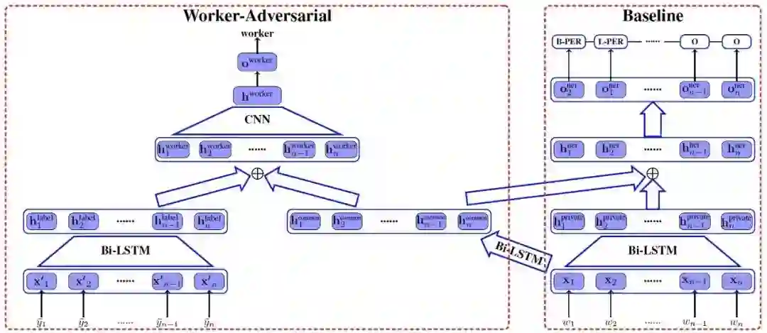 私有信息的LSTM称为“private”,它的学习目标是拟合各位标注员的独立分布;而共有信息的LSTM称为“common”,它的输入是句子,它的作用是学习标注结果之间的共有特征,。