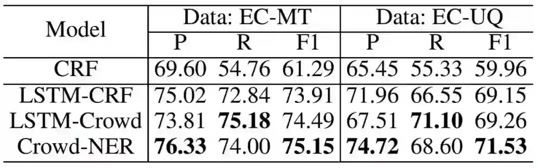 在实际的实体识别任务中,我们把common和private的LSTM特征和标注员ID向量合并,作为实体标注部分的输入,最后用CRF层解码完成标注任务。