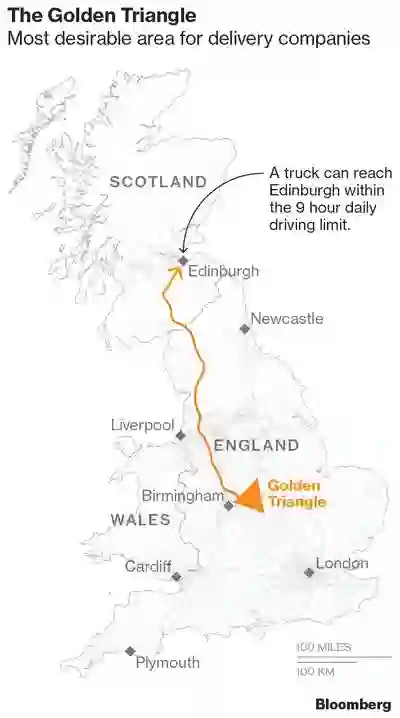 在英国,一些最受送货公司欢迎的地区,比如位于英国中心的所谓金三角,可能会遭受打击,因为货物投递已经不再受制于驾驶员的换班。长期以来,像亚马逊(Amazon.com)这样的公司不得不在该地区(其独特优势是,它距离英国大部分地区只有一个班次的车程)建立物流中心,由此推高了当地的仓库租金。