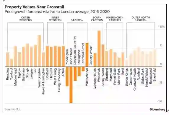 伦敦横贯铁路(Crossrail)附近的房产价格:相对于2016年至2020年伦敦房产均价的涨幅 数据来源:仲量联行