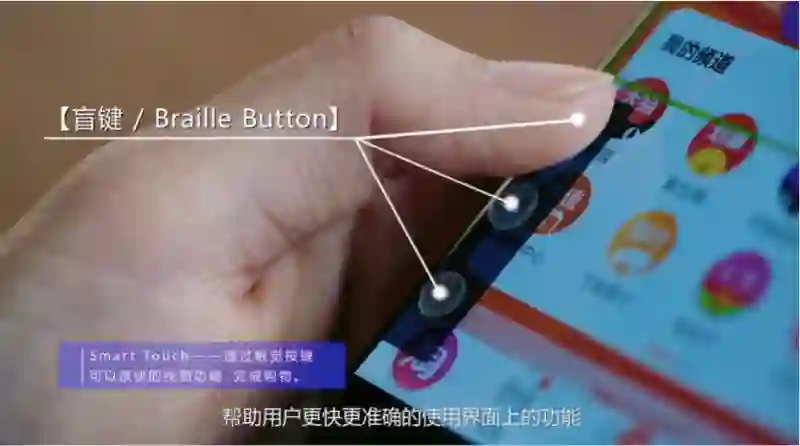 具体做法是:给手机贴一个新的“屏幕保护膜”,上面有支持触觉交互的“盲键”,通过低成本的屏幕盲键按钮提供触觉。更重要的是根据页面的动态变化,盲键对应的功能也随之改变,提升交互效率和用户体验。