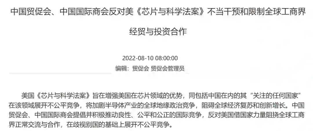 针对美国的《芯片与科学法案》,中国国际贸易促进会、中国国际商会发布了「反对美《芯片与科学法案》不当干预和限制全球工商界经贸与投资合作」的声明。