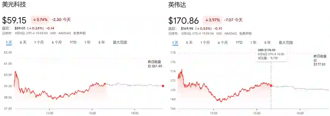 在拜登签署《芯片与科学法案》当天,美股尤其是芯片股全线大幅下跌。其中,美光科技收跌 3.74%,英伟达收跌 3.97%。这两大芯片制造厂商都先后下调了业绩预期。