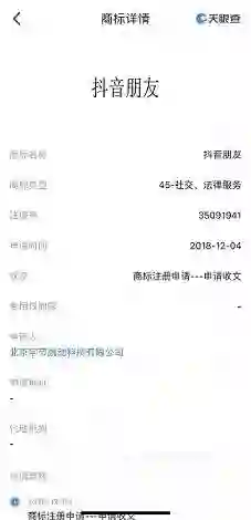 据三言财经 12月4日,北京字节跳动科技有限公司提交了一份名为“抖音朋友”的商标申请。根据天眼查相关信息显示,“抖音朋友”商标申请人为北京字节跳动科技有限公司,申请号为35091941,该商标国际分类为社交、法律服务类。目前处于“申请收文”状态。