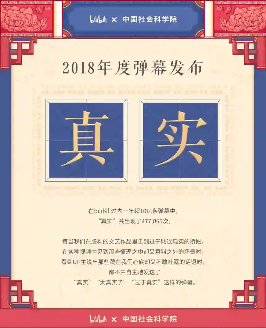 新榜讯 12月27日,哔哩哔哩(以下简称“B站”)联合中国社会科学院共同发布了2018年度弹幕——“真实”,这也是B站推出的第二届年度弹幕盘点。