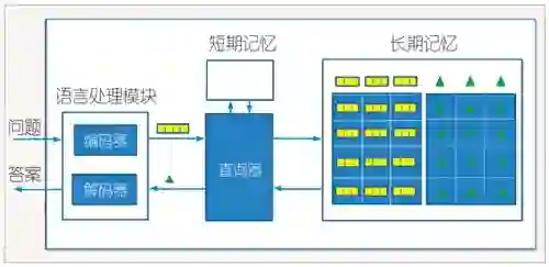 记忆网络由神经网络和长期记忆组成。长期记忆是一个矩阵,矩阵的每一个行向量是一个句子的语义表示。阅读时,记忆网络可以把给定的句子转换成内部表示,存储到长期记忆中。问答时,把问句也转换成内部表示,与长期记忆中每行的句子语义表示进行匹配,找到答案,并做回答。