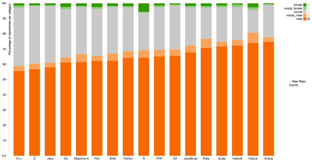 GitHubrepo按照语言划分的男女用户比例,最上面的绿色是确认的女用户(2014年数据)