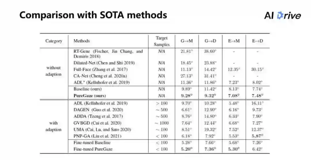 另外,对微调后的结果来看,Fine-tuned Baseline 比 Fine-tuned PureGaze 的结果还是要高一点的,这说明了我们的方法,并不是只学习了一个比较好的通用模型,而是能够真正地学习到特征的表示,这种特征表示在进行微调过后,也保持了比较好的效果。