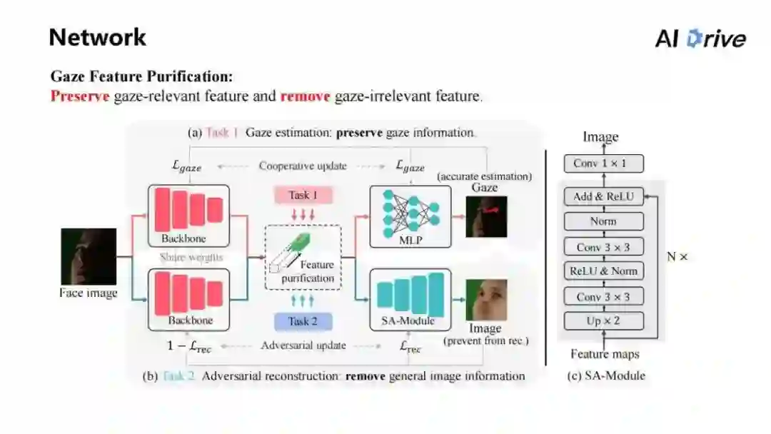 所以,整个的 Framework 中,为了解决 Gaze FeaturePurification 的问题,对其中的保留视线相关特征和移除视线无关特征,要通过两个任务进行,第一个是保留视线信息,第二个是移除掉所有的图片信息。通过这样的任务,达到 Feature Purification。